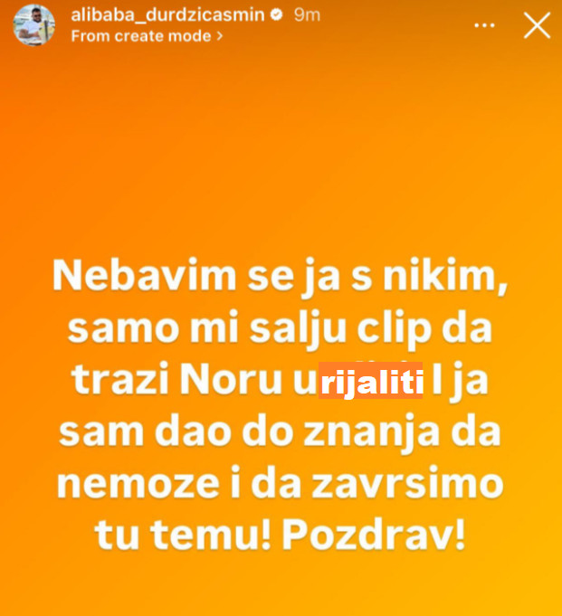 -Ne bavim se ja ni sa kim, samo mi šalju klip da traži Noru u rijaliti. I ja sam dao do znanja da ne može da završimo tu temu! Pozdrav – napisao je Asmin.
