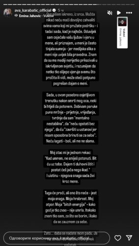 – Moj otac mi je jednom rekao: „Kad umrem, ne smeš potonuti. Biću uz tebe. Dajem ti duhovni štit i postaćeš jača nego ikad.“ I uistinu – njegova snaga sada živi kroz mene. Tuga će proći, ali ono što neće – jest moja snaga. Moja hrabrost. Moj otpor. Moja „bič energija“, kako god je ko zvao, nije umrla. I te kako znam ko sam, za što se borim, i kako da se zauzmem za sebe. Zato, džaba se nadate mom padu. Ja ne tonem. Ja rastem. I ovo je tek početak – napisala je Ava na Instagramu.