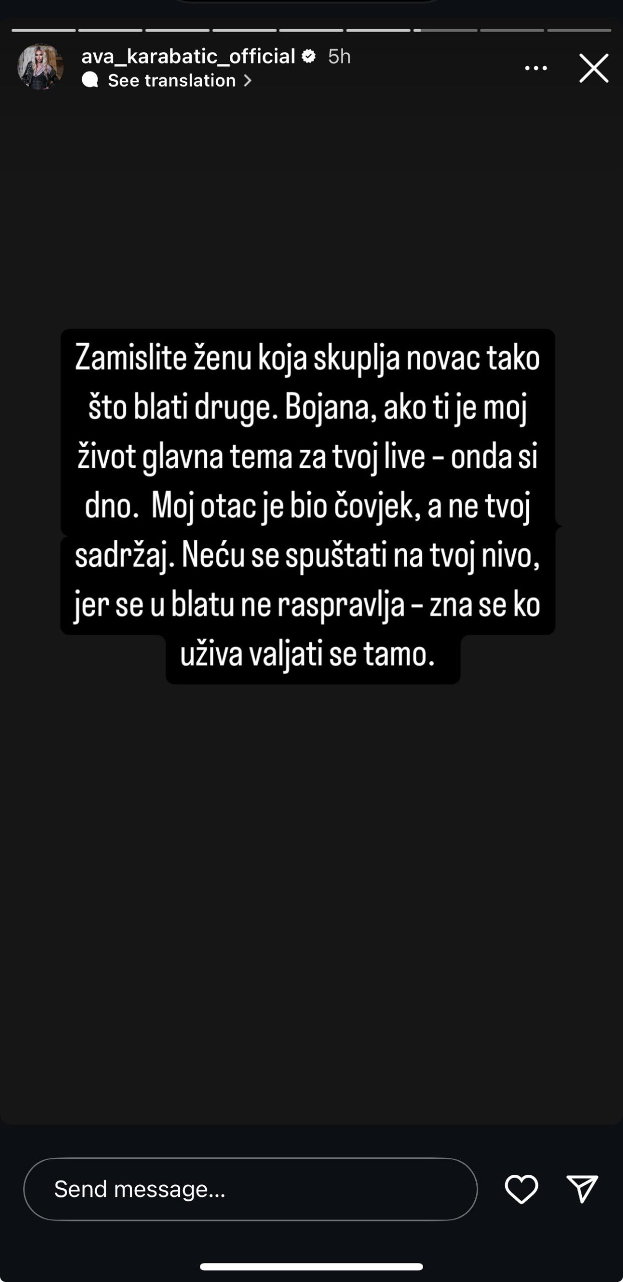 -Zamislite ženu koja skuplja novac tako što blati druge. Bojana, ako ti je moj život glavna tema za tvoj lajv, onda si dno. Moj otac je bio čovek, a ne tvoj sadržaj. Neću se spuštati na tvoj nivo jer se u blatu ne raspravlja – zna se ko uživa da se valja tamo – zaključila je Ava.