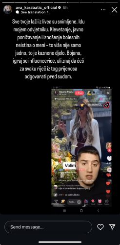 -Sve tvoje laži iz lajva su snimljene. Idu mom advokatu. Klevetanje, javno ponižavanje i iznošenje bolesnih neistina o meni – to više nije samo jadno, to je krivično delo. Bojana, igraj se influenserke, ali znaj da ćeš za svaku reč iz tog prenosa odgovarati pred sudom – naglasila je Karabatićeva.
