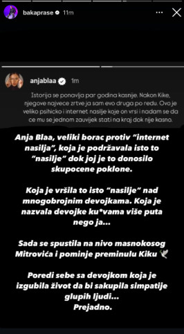 -Anja Bla, veliki borac protiv „Internet nasilja“, koja je podržavala isto to „nasilje“ dok joj je to donosilo skupocene poklone. Vršila je to isto „nasilje“ nad mnogobrojnim devojkama, koja je nazvala devojke k*rvama više puta nego ja. Sada se spustila na nivo masnokosog Mitrovića i pominje preminulu Kiku. Poredi sebe sa devojkom koja je izgubila život da bi sakupila simpatije glupih ljudi. Prejadno – istakao je Bogdan, te dodao: