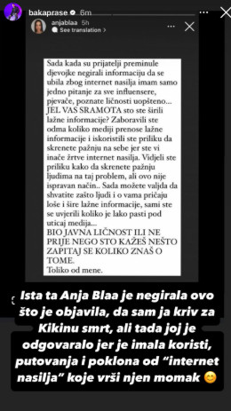-Ista da Anja Bla je negirala ovo što je objavila, da sam ja kriv za Kikinu smrt, ali tada sam joj je odgovaralo jer je imala koristi, putovanja i poklona od „Internet nasilja“ koje vrši njen momak – završio je on.