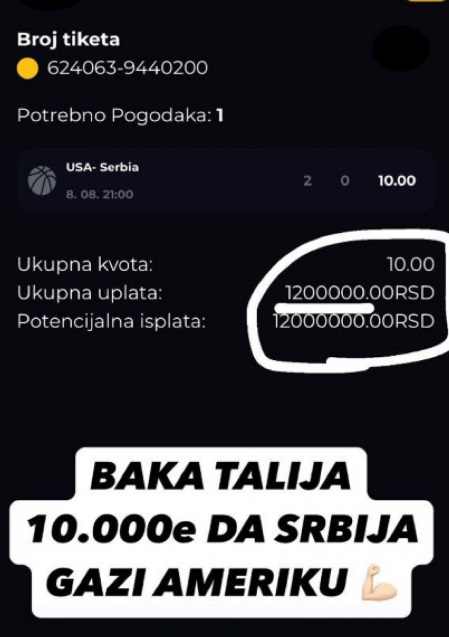 Kvota na pobedu Srbije je 10, on je uložio 1.200.000 dinara (10.000 evra), a dobitak će biti 12 miliona dinara (100.000 evra).