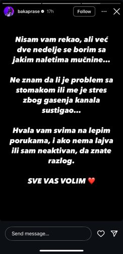 – Nisam vam rekao, ali već dve nedelje se borim sa jakim naletima mučnine… Ne znam da li je problem sa stomakom ili me je stres zbog gašenja kanala sustigao… Hvala vam svima na lepim porukama i ako nema lajva ili sam neaktivan, da znate razlog. Sve vas volim – napisao je Baka u nastavku.