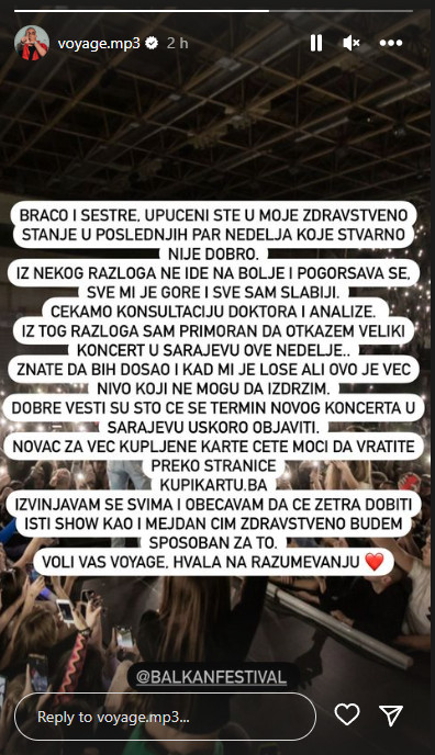 Pevač Voyage je na svojim društvenim mrežama objavio saopštenje kako se koncert otkazuje, ali i da je razlog za to njegovo zdrastveno stanje, što je naišlo na sumnju u javnosti.