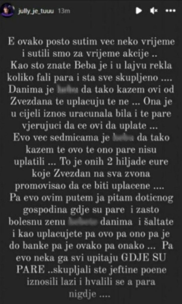 – To je onih 2.000 evra koje je Zvezdan na sva zvona promovisao da će biti uplaćene. Pa, evo, ovim putem ja pitam dotičnog gospodina, gde su pare i zašto bolesnu ženu j***te danima i šaltate i kao uplaćujete, pa ovo, pa ono, pa je do banke, pa je ovako, pa onako. Pa evo, neka ga svi upitaju gde si pare? Skupljali ste jeftine poene, iznosili laži i hvalili se, a para nigde – glasi ova objava.