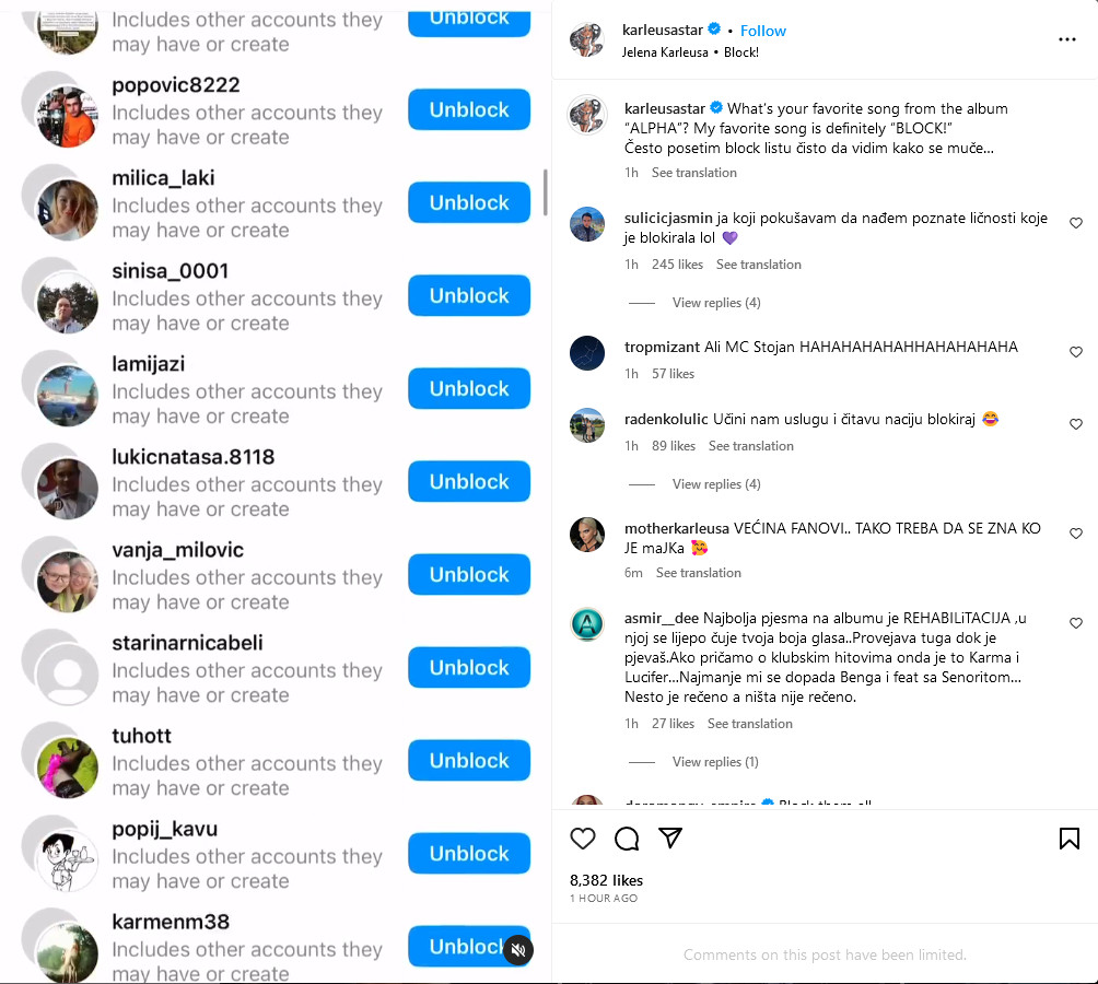 „Ja koji pokušavam da pronađem poznate ličnosti koje je blokirala, lol“, „Opalila si svima ne šamar, nego eksploziju“, „Kako im je u paklu?! Hahaha“, „Pokaži milost, odblokiraj me“, „Blok je mama, kraljice“.