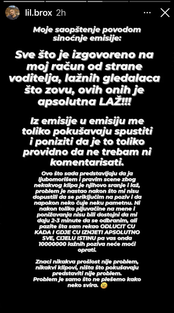 – Sve što je izgovoreno na moj račun od strane voditelja, lažnih gledalaca što zovu, ovih i onih, apsolutna je laž! Iz emisije u emisiju me pokušavaju spustiti i poniziti, da je to toliko providno da ne treba ni da komentarišem – započeo je Brajlović svoju verziju priče, vidno besan.