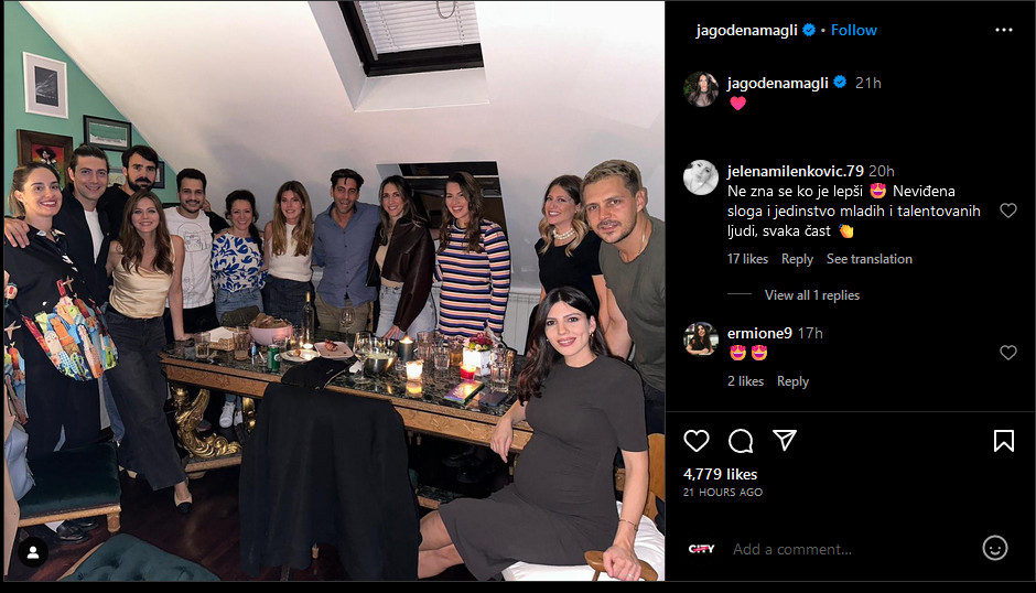 Miloš se ne odvaja od nje, pa je tako bilo i na druženju sa prijateljima. Jelisaveta Orašanin je, naime, objavila fotografiju na kojoj su Ivana, Biković i ona u društvu brojnih kolega, a među njima je bila još jedna trudnica – Anja Alač.