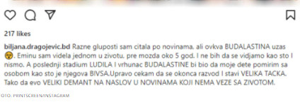 „Razne gluposti sam čitala po novinama, ali ovakva budalaština je užas. Eminu sam videla jednom u životu, pre možda oko 5 godina. I ne bih da se viđamo kao što i nismo. A poslednji stadium ludila i vrhunac budalaštine bi bio da moje dete pomirim sa osobom kao što je njegova bivša. Upravo čekam da se okonča razvod i stavi velika tačka. Tako da, evo, veliki demant“, napisala je Biljana na društvenim mrežama.
