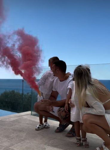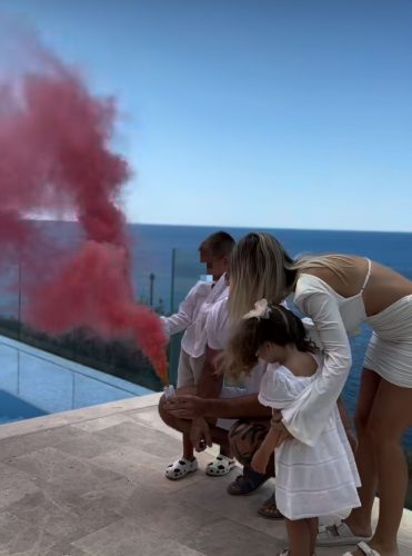 Nasmejana i srećna porodica se snimila pokraj mora gde odmaraju i uživaju trenutno. Oni su napravili mali gender reaveal party ili ti zabavu otkrivanja pola bebe, a za to su bili zaduženi njen suprug i sin koji su držali male baklje iz kojih je izašao roze dim što znači da očekuju devojčicu.