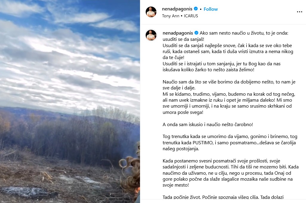 „Ako sam nesto naučio u životu, to je onda: usuditi se da sanjaš! Usuditi se da sanjaš najlepše snove, čak i kada se sve oko tebe ruši, kada ostaneš sam, kada ti duša vristi iznutra a nema nikog da te čuje! Usuditi se i istrajati u tom sanjanju, jer tu Bog kao da nas iskušava koliko žarko to nešto zaista želimo! Naučio sam da što se više borimo da dobijemo nešto, to nam je sve dalje i dalje. Mi se kidamo, trudimo, vijamo, budemo na korak od tog nečeg, ali nam uvek izmakne iz ruku i opet je miljama daleko! Mi smo sve umorniji i umorniji, i na kraju se samo srusimo skrhkani od umora posle svega! A onda sam iskusio i naučio nešto čarobno“, napisao je Nenad pa nastavio.