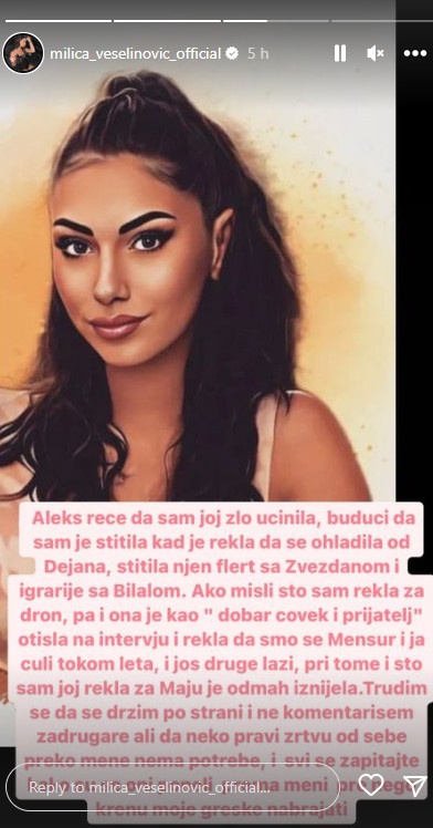 – Aleks reče da sam joj zlo učinila, budući da sam je štitila kad je rekla da se ohladila od Dejana, štitila njen flert sa Zvezdanom i igrarije sa Bilalom. Ako misli što sam rekla za dron, pa i ona je kao „dobar čovek i prijatelj“ otišla na intervju i rekla da smo se Mensur i ja čuli tokom leta, i još druge laži, pritom i što sam joj rekla za Maju je odmah iznela – napisala je Milica.