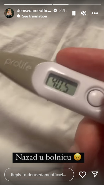 – Nazad u bolnicu – napisala je Deniz uz snimak, na kom se vidi da ima preko 40 temperaturu.