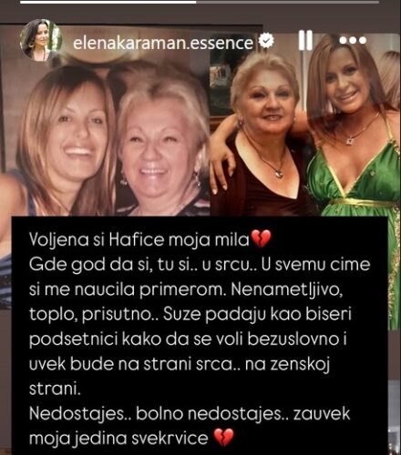 Bivša Elenina svekrva, majka Jugoslava Karića, Hafa preminula je pre dva dana, a tim povodom oglasila ćerka Verice Rakočević dirljivim rečima. Ona je uz njihove zajedničke slike napisala: