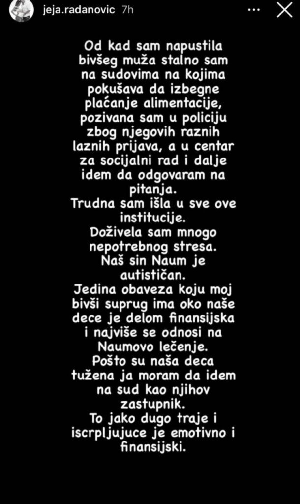 – Trudna sam išla u sve ove institucije. Doživela sam mnogo nepotrebnog stresa. Naš sin Naum je autističan. Jedina obaveza koju moj bivši suprug ima oko naše dece je delom finansijski i najviše se odnosi na Naumovo lečenje. Pošto su naša deca tužena, ja moram da idem na sud kao njihov zastupnik. To jako dugo traje i icrpljujuće je – priznala je Jelena.