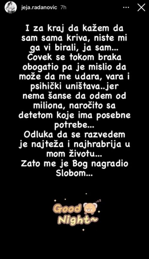 – Sama sam kriva, ja sam ga birala. Čovek se tokom braka obogatio pa je mislio da može da me udara, vara i psihički uništava. Mislio je da neću otići od miliona, naročito sa detetom koje ima posebne potrebe.