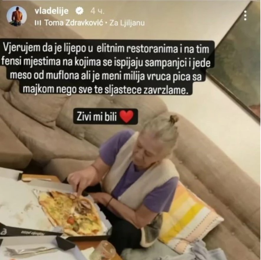 Bivši zadrugar Vladimir Tomović podelio je na svom Instagram profilu fotografiju sa svojom majkom Ljiljanom. Njih dvoje su uživali u vrućoj pici, a Vladimir je otkrio koliko mu znače ovi trenuci. Uz objavu je podelio i pesmu „Za Ljiljanu“, koju je otpevao Toma Zdravković.