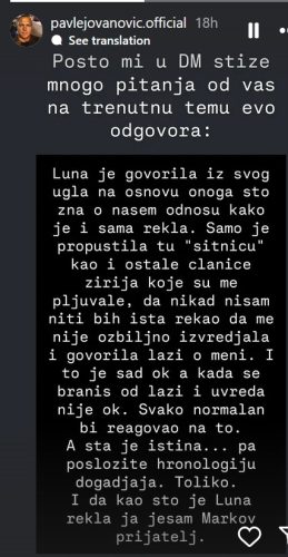 – Luna je govorila iz svog ugla na osnovu onoga što zna o našem odnosu kako je i sama rekla. Samo je propustila tu sitnicu kao i ostale članice žirija koje su me pljuvale, da nikad nisam niti bih išta rekao da me nije ozbiljno izvređala i govorila laži o meni. I to je sad ok, a kad se braniš od laži i uvreda nije ok. Svako normalan bi reagovao na to. A šta je istina… pa posložite hronologiju događaja. Toliko. I da, kao što je Luna rekla, ja jesam Markov prijatelj – napisao je.