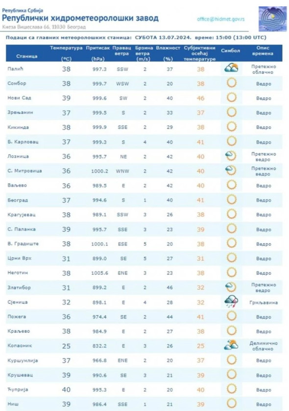 RHMZ je objavio u 15 časova presek temperatura u većim gradovima Srbije. A u Ćurpriji je zabeleženo 40 stepeni u hladu!