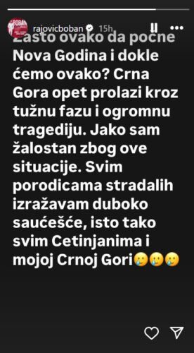 „Zašto ovako da počne Nova godina i dokle ćemo ovako? Crna Gora opet prolazi kroz tužnu fazu i ogromnu tragediju. Jako sam žalostan zbog ove situacije. Svim porodicama stradalih izražavam duboko saučešće, isto tako svim Cetinjanima i mojoj Crnoj Gori“, napisao je Rajović.