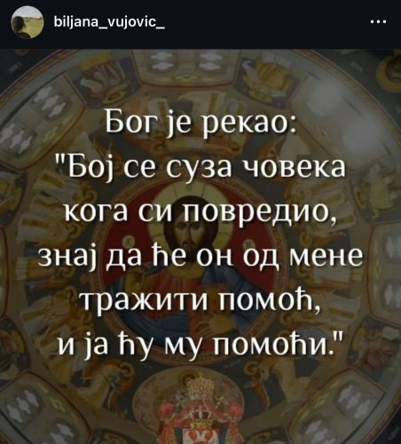 – Bog je rekao: „Boj se suza čoveka koga si povredio, znaj da će on od mene tražiti pomoć i ja ću mu pomoći – glasi citat koji je Biljana objavila na društvene mreže.