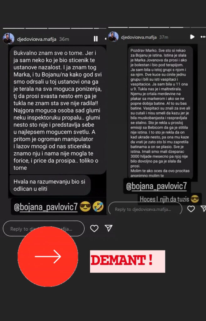 “Sto je rekla u prosloj emisiji sa Bebicom da ga je stitila nije istina. I to sto je rekla da on kad ukrade nesto, pa ona mu kaze da vrati je zato sto bi mu zapretila batinama a on se plasio. Sve je istina, Imali smo mali dzeparac 3000 hiljade mesecno. Pa njoj nije bilo dovoljno pa ga je slala da prosi.”, glasila je objava a onda se oglasila i Bojana nakon što je objavila ove poruke.