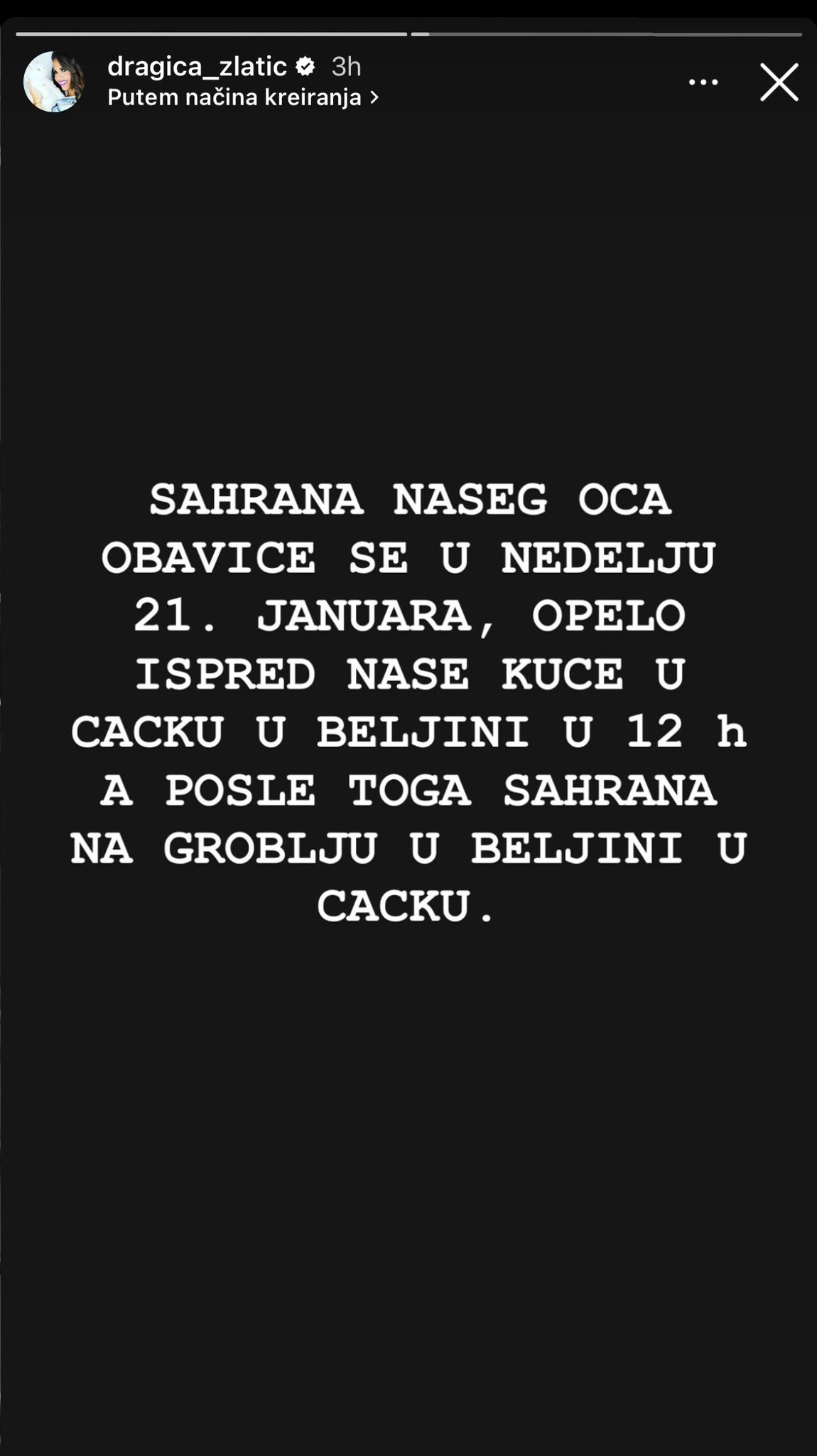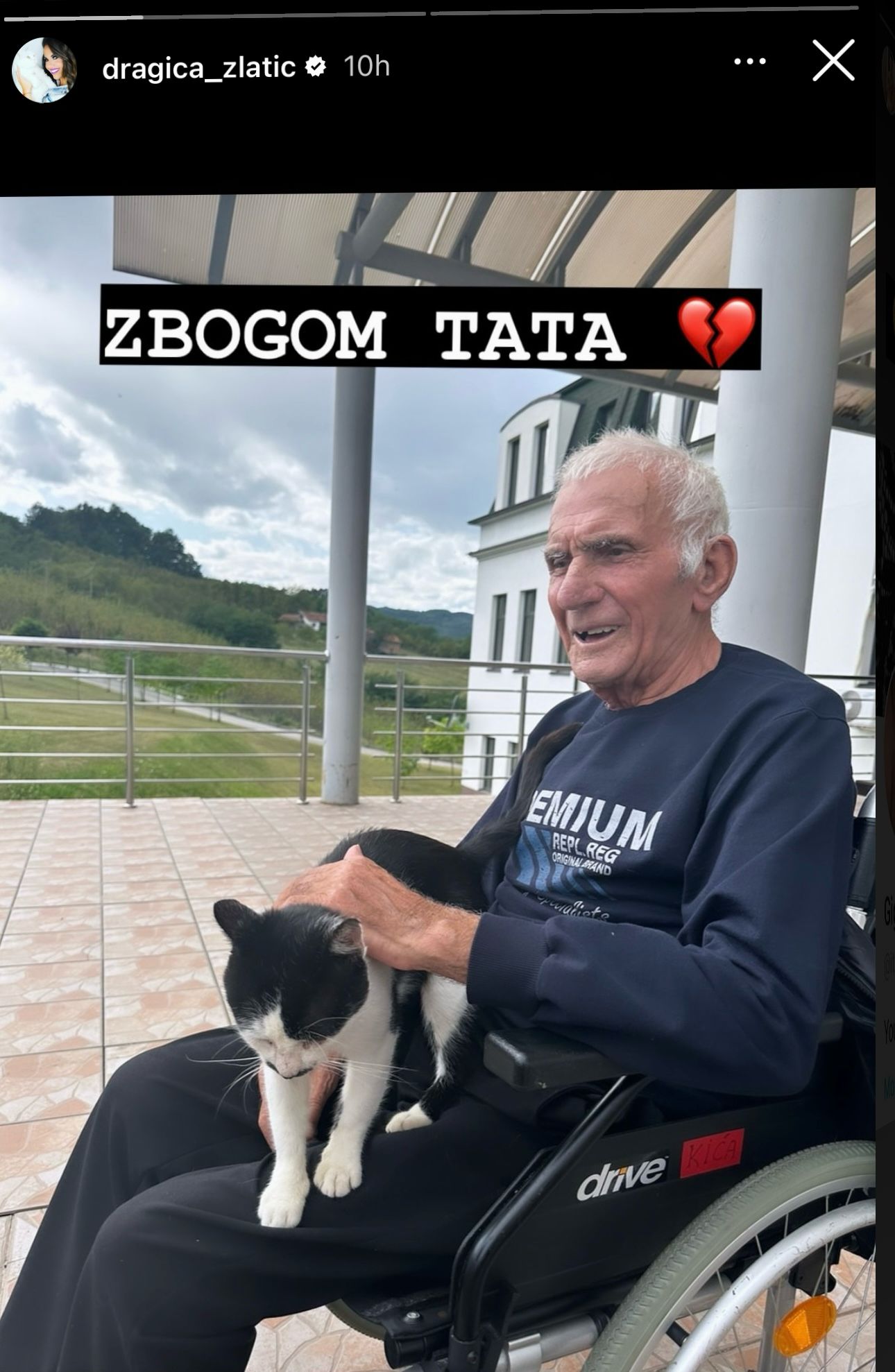 Dragica je podelila dva storija, na prvom sliku pokojnog oca u invalidskim kolicima sa tekstom preko slike „ZBOGOM TATA“ i emotikon slomljenog srca.