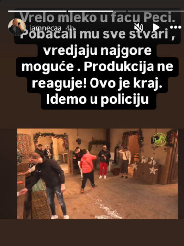 – Vrelo mleko u facu Peci. Pobacali mu sve stvari, vređaju najgore moguće. Produkcija ne reaguje! Ovo je kraj. Idemo u policiju – napisao je Neca Lazić na svojoj objavi video snimka na kom se ceo incident i vidi.