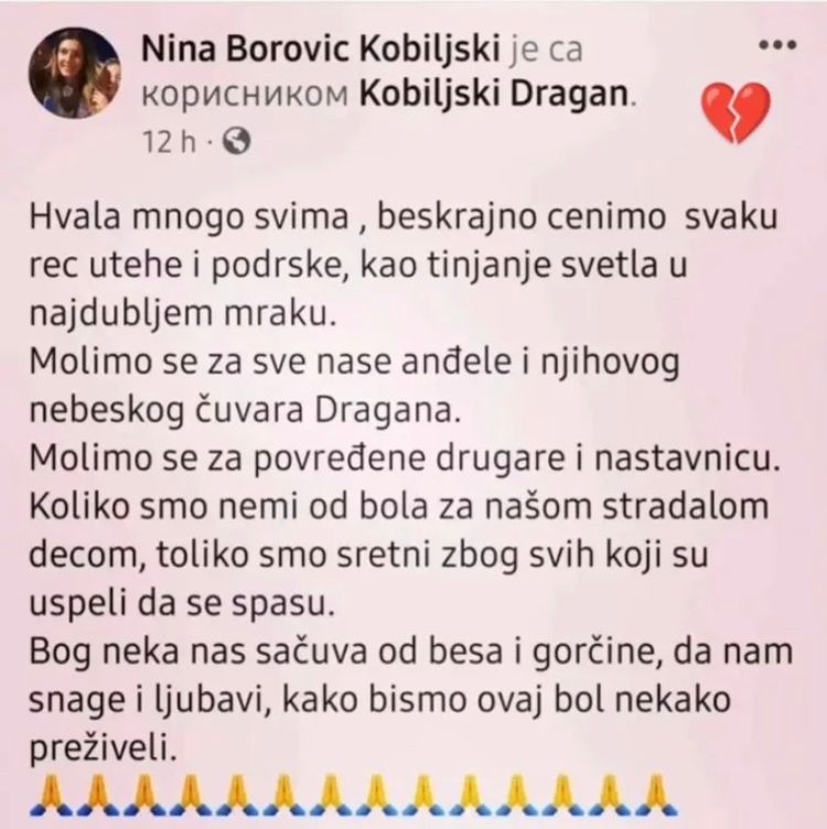 Hvala puno svima, beskrajno cenimo svaku reč utehe i podrške, kao sjajna svetlost u najdubljoj tami. Molimo se za sve naše anđele i njihovog nebeskog čuvara Dragana. Molitva za povređene drugare i učiteljicu. Koliko smo tihi od bola naše povređene dece, tako smo srećni zbog svih koji su uspeli da budu spaseni. Bože, sačuvaj nas od besa i gorčine, daj nam snage i ljubavi, da nekako preživimo ovaj bol – napisali su Nina i Dragan.