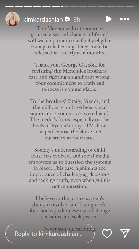 „Dobili su drugu šansu u životu i biće uslova za saslušanje o uslovnom otpuštanju. Mogli bi biti oslobođeni u roku od šest meseci„, započela je Kim putem svog obraćanja na ovoj mreži.