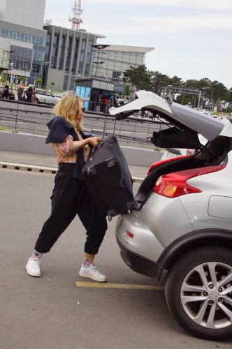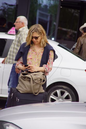 Glumica je za putovanje obukla kežual garderobu i patike, a sama je vukla jedan veliki kofer i glomaznu torbu. Po izlasku sa aerodroma je bila vidno neraspoložena dok je razgovarala na telefonu.