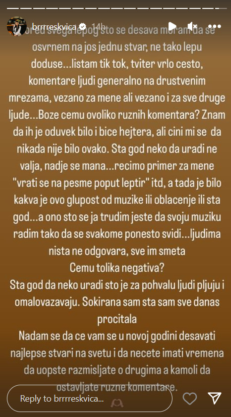 “Pored svega lepog što se dešava moram da se osvrnem na još jednu stvar, ne tako lepu doduše…Listam Tiktok, Tviter vrlo često, komentare ljudi na društvenim mrežama generalno, vezano za mene, ali vezano i za sve druge ljude… Bože čemu ovoliko ružnih komentara? Znam da ih je oduvek bilo i biće hejtera, ali čini mi se da nikada nije bilo ovako. Šta god da neko uradi ne valja, nađe se mana… Recimo primer za mene “Vrati se na pesme poput ‘Leptir’ “ itd, a tada je bilo „Kakva je ovo glupost od muzike“ ili „oblačenje“ ili šta god… A ono što se ja trudim jeste da svoju muziku radim tako da se svakome ponešto svidi… Ljudima ništa ne odgovara, sve im smeta. Čemu tolika negativa? Šta god da neko uradi što je za pohvalu, ljudi pljuju i omalovažavaju. Šokirana sam šta sam sve danas pročitala. Nadam se da će vam se u novoj godini dešavati najlepše stvari na svetu i da nećete imati vremena da uipšte razmišljate o drugima, a kamoli da ostavljate ružne komentare“, napisala je Breskvica na svom Instagram storiju.