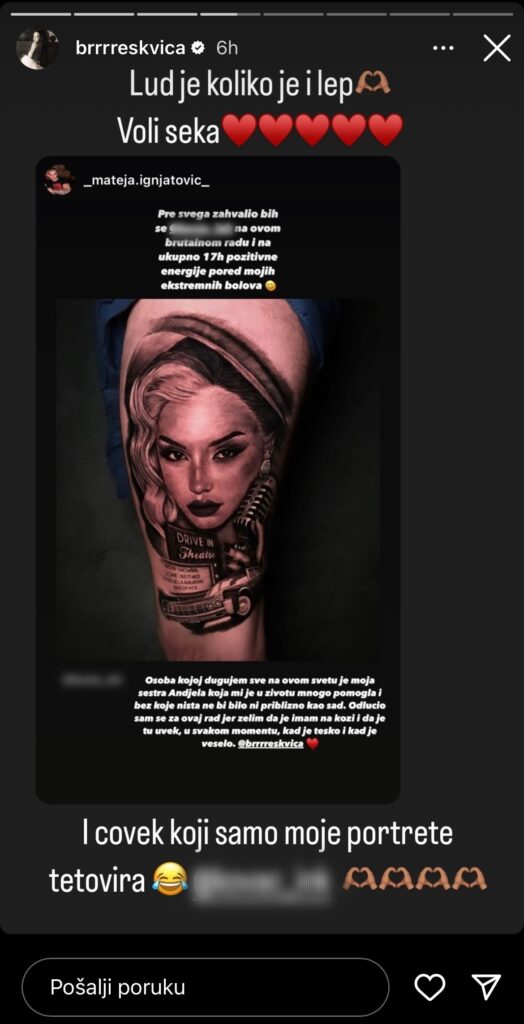 Breskvica je podelila fotografiju tetovaže s oduševljenjem, komentarišući: „Lud je koliko je i lep. Voli seka.“ Ovaj gest bratske ljubavi naišao je na oduševljenje fanova.