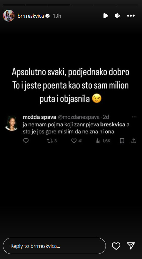 Jedan od korisnika je napisao: „Ja nemam pojma koji žanr peva Breskvica, a što je još gore mislim da ne zna ni ona.“ Na to je Breskvica odgovorila putem svog Instagram storija: „Apsolutno svaki, podjednako dobro. To i jeste poenta kao što sam milion puta i objasnila.“