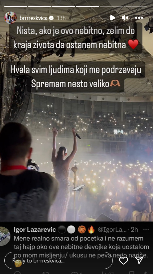 Breskvica je odgovorila na ovu kritiku snimkom nedavno održanog koncerta pred punom halom „Čair“ u Nišu. „Ništa, ako je ovo nebitno, želim do kraja života da ostanem nebitna. Hvala svim ljudima koji me podržavaju. Spremam nešto veliko,“ napisala je pevačica, poručujući da će nastaviti da sledi svoj umetnički put, ne obazirući se na negativne komentare.