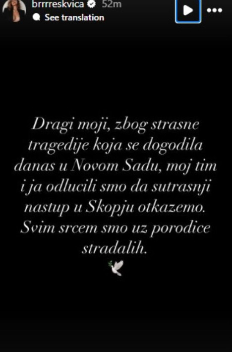 – Dragi moji, zbog strašne tragedije koja se dogodila danas u Novom Sadu, moj tim i ja smo doneli odluku da sutrašnji nastup u Skoplju otkažemo. Svim srcem smo uz porodice stradalih.