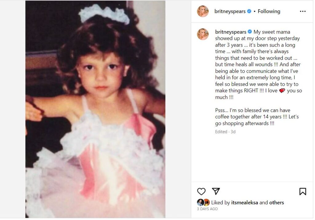 Zvezda skandala Britni Spirs se posle dužeg vremena videla sa majkom, a povodom tog događaja je na svom Instagram profilu, otvoreno i iskreno iznela svoja osećanja, nakon što ju je majka posetila.