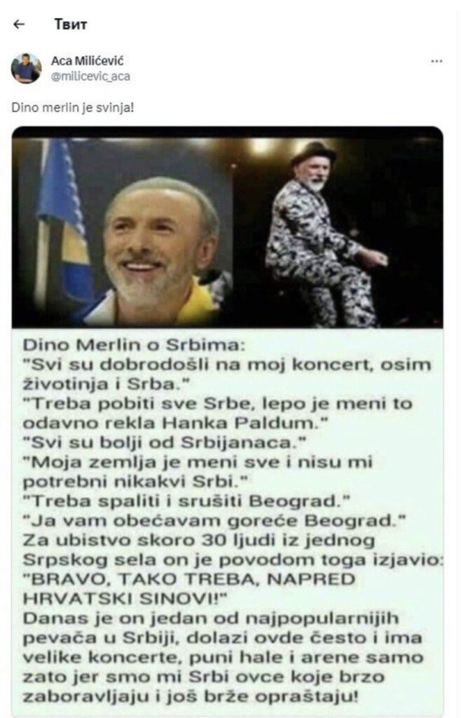 Podsetimo, u jeku negodovanja oko najavljenih nastupa Dina Merlina u Srbiji, na društvenim mrežama isplivao je video-zapis iz 1993. godine, na kome Dervišhalidović peva pesmu „Da te nije Alija“, i to ratnim zločincima, pripadnicima Armije Bosne i Hercegovine.