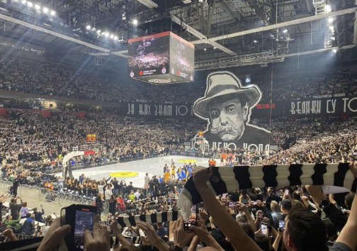 „Stop francuskoj vojnoj operaciji ’Skaj’ u Srbiji! Sloboda za grobare!” – pisalo je na transparentu koji je jedan deo navijača Partizana raširio na tribinama na utakmici košarkaške Evrolige s Makabijem u petak uveče u beogradskoj Štark areni.