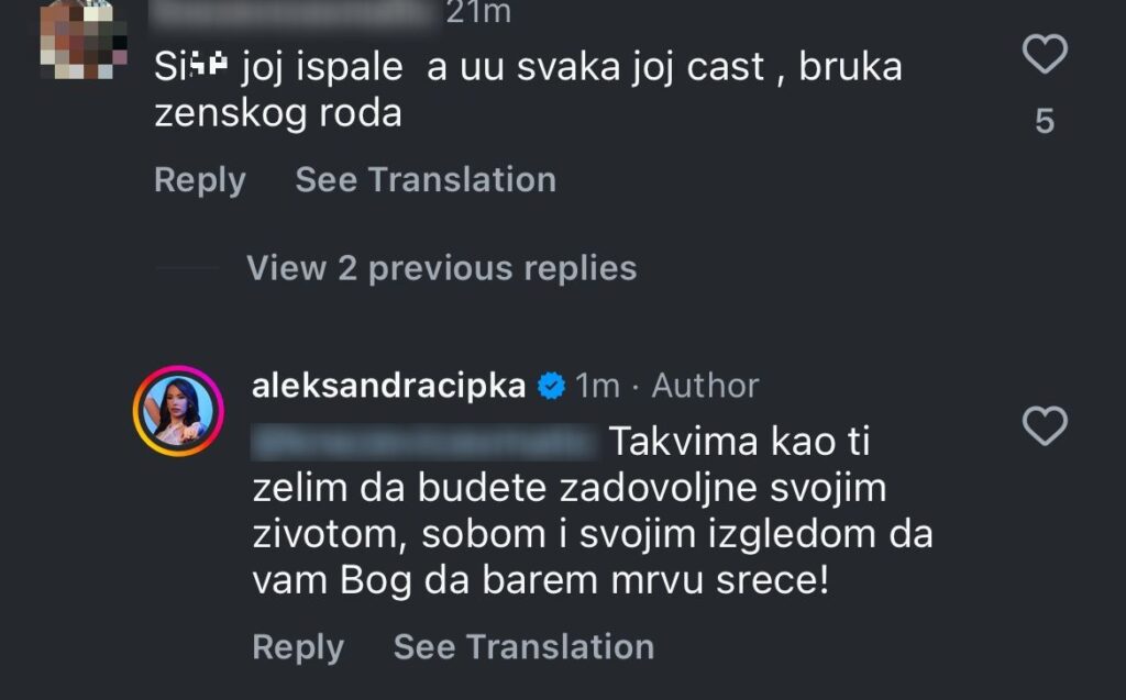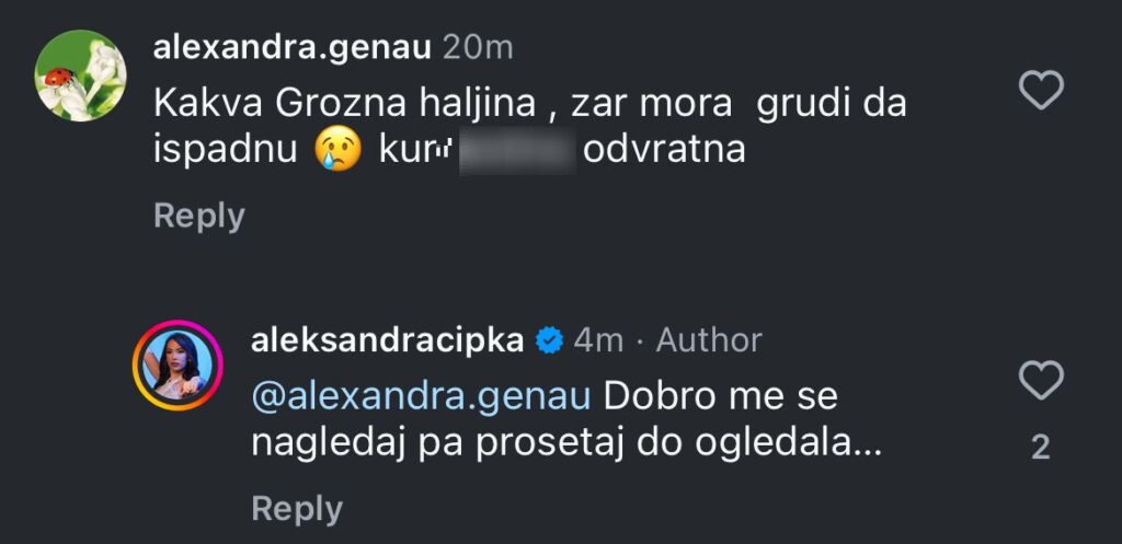„Užasna haljina, si*e joj vire“, „Da li ti je ovo tata?“, glasile su neke morbidnosti na koje je Aleksandra odgovarala.