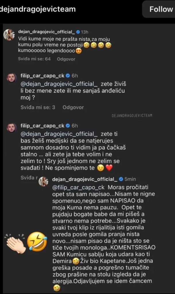 Moraš pročitati opet šta sam napisao… Nisam te nigde spomenuo, nego sam napisao da moja kuma nema pauzu. Opet te pujdaju bogate babe da mi pišeš, stvarno nema potrebe. Svakako je svaki tvoj klip iz rijalitija isti, gomila uvreda, posle gomila pranja, ništa novo… Nisam pisao da je ništa što se tiče tvojih monologa… Komentarisao sam kumicu sablju, koja udara kao ti Demira! Živ bio, kapetane. Još jedna greška posade, a pogrešno tumačite zbog prašine na stolu, izgleda da je alergija. Odjavljujem se, idem čamcem – u svom stilu napisao je Dragojević, a ostaje da vidimo kako će se nastaviti ovaj rat.