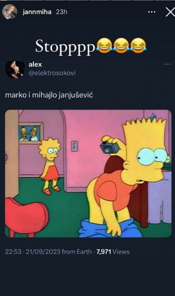 Naime, u pitanju je fotografija iz Simpsonova na kojoj Bart slika svoju zadnjicu, dok ga u potpunom šoku gleda sestra Lisa, naravno ovo je slikovito opisana situacija između braće Janušević – setio se jedan kreativan korisnik mreža.