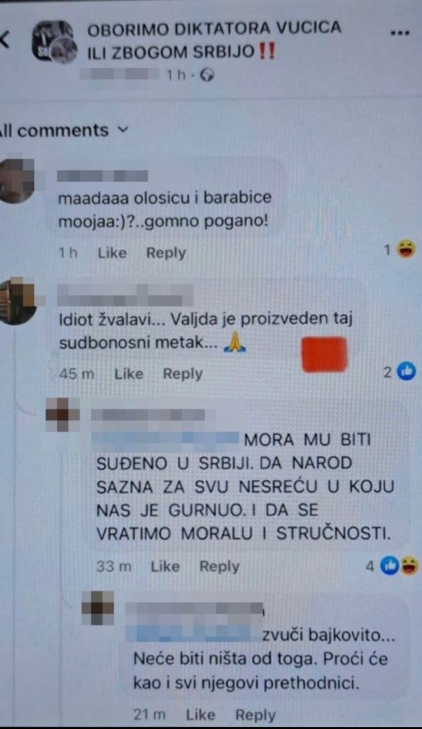Sumnja se da je uhapšeni na Fejsbuk grupi: „Oborimo diktatora Vučića ili zbogom Srbijo“ napisao komentar: „Idiot žvalavi. Valjda je proizveden taj subonosni metak?“.