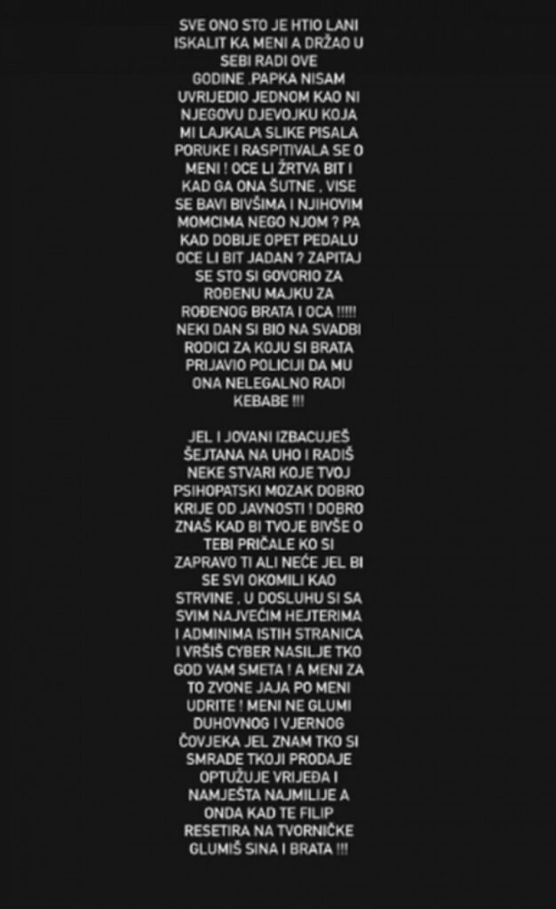 – Nisam ga hteo da ga uvredim nijednom, kao ni njegovu devojku koja mi je lajkovala fotografije, pisala poruke i raspitivala se za mene. Hoće li biti žrtva kada ga i ona šutne? Više se bavi bivšima i njihovim momcima nego njom. Pa kad opet dobije pedalu hoće li biti jadan? Zapitaj se šta si govorio za rođenu majku i za rođenog brata i oca. Dobro znaš da kad bi tvoje bivše o tebi pričale ko si zapravo, ali neće. Meni nemoj da glumi duhovog i vernog čoveka jer znam ko si – napisao je Filip Car između ostalog.