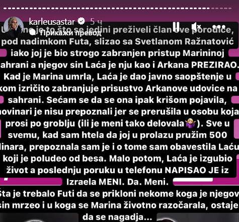 – Užasno je to što se jedini preživeli član ove porodice, pod nadimkom Futa, slizao sa Svetlanom Ražnatović iako joj je bio strogo zabranjen pristup na Marininoj sahrani, a njegov sin Laća je nju kao i Arkana prezirao. Kada je Marina umrla, Laća je dao javno saopštenje u kom izričito zabranjuje prisustvo Arkanove udovice na sahrani. Sećam se da se ona ipak krišom pojavila, novinari je nisu prepoznali jer se prerušila u osobu koja prosi po groblju (ili je meni tako delovala). Sve u svemu, kada sam htela da joj u prolazu dam 500 dinara, prepoznala sam je i o tome sam obavestila Laću, koji je poludeo od besa. Malo potom, Laća je izgubio život, a poslednju poruku u telefonu, napisao je iz Izraela meni. Da. Meni. Šta je trebalo Futi, da se prikloni nekome, koga je njegov sin mrzeo i u koga se Marina životno razočarala, ostaje da se nagađa…– napisala je Jelena na svom Instagram profilu.