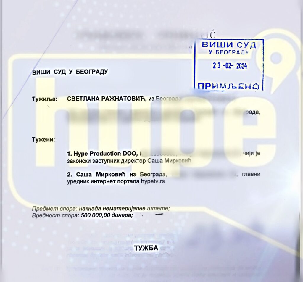 Na adresu Hype televizije stigla je tužba srpske maćehe Svetlane Cece Ražnatović, upućena televiziji, ali i direktoru televizije.