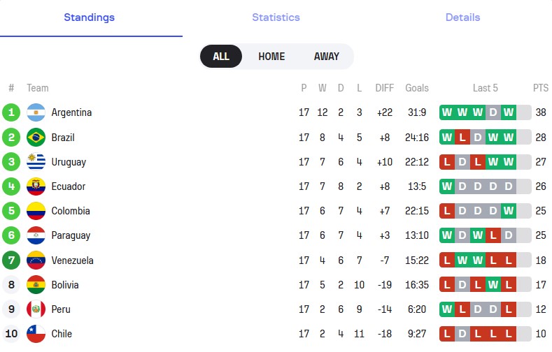 U igri za to mesto su Venecuela sa 18 i Bolivija sa 17 bodova. U poslednjem kolu, u utorak, Venecuela dočekuje Kolumbiju, a Bolivija će ugostiti Brazil.