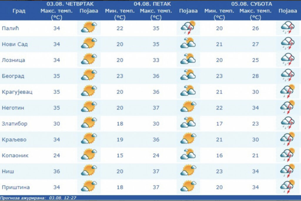 Kasnije posle podne i uveče u zapadnim i severnim, kao ponegde i u centralnim predelima, uz lokalni razvoj oblačnosti, mestimično se očekuju kratkotrajni pljuskovi sa grmljavinom. Najniža temperatura od 18 do 24, najviša od 34 do 38 stepeni.