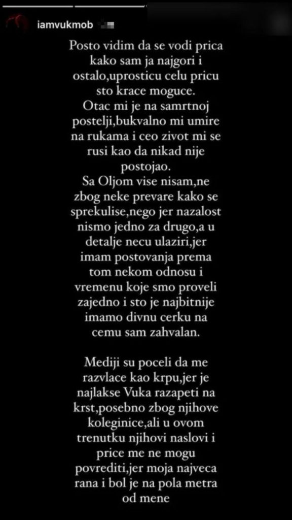 – Pošto vidim da se vodi priča kako sam ja najgori i ostalo, uprostiću celu priču što kraće moguće. Otac mi je na samrtnoj postelji, bukvalno mi umire na rukama i ceo život mi se ruši kao da nikad nije postojao. Sa Oljom više nisam, ne zbog neke prevare kako se spekuliše nego zato što nažalost nismo jedno za drugo, a u detalje neću ulaziti jer imam poštovanja prema tom nekom odnosu i vremenu koje smo proveli zajedno i što je najbitnije imamo divnu ćerku na čemu sam veoma zahvalan – započeo je Vuk, pa dodao: